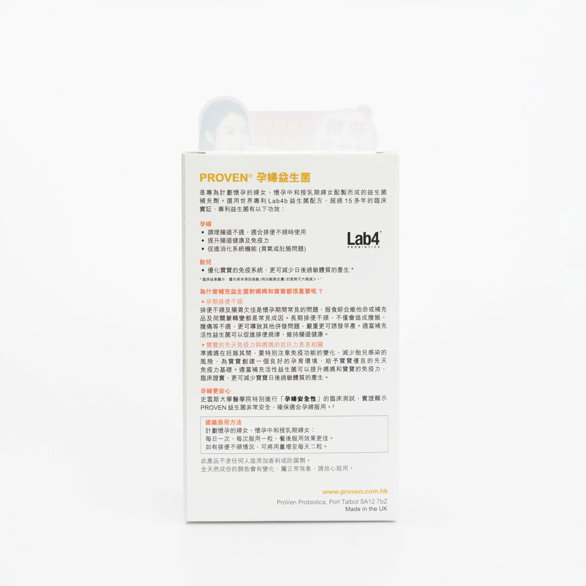 除了於懷孕期間服用,請於寶寶出生後,添加 ProVen Baby Probiotics 嬰兒配方於寶寶的飲食中,持續最少六個月。